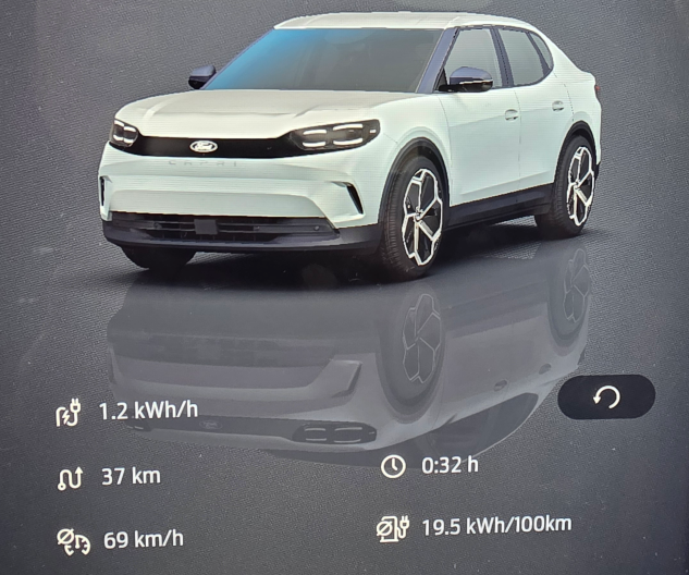 Sofort auffällig beim Ford Capri (Details auf evkx.net) ist das große, hochkant montierte und etwas schräg nach unten/oben verschiebbare Display auf der Mittelkonsole. Es wird beworben mit einem “versteckten” Fach, aber für mich persönlich war alles irgendwie viel zu weit unten angesiedelt. Der Blick seitlich runter aufs Navi war dann eher mehr ablenkend, trotz des großen Displays. Die Kofferraumgröße schien ok, etwas kleiner als beim IONIQ 5, aber wäre noch im Rahmen gewesen, Frunk gibt es hier bei Ford keinen bzw. generell der MEB-Familie nicht soweit ich weiß. Die Sitze waren bequem und auch die kurze Probefahrt an sich sehr angenehm. Für einen Test der Assistenzsysteme war die verfügbare Zeit aber zu kurz. Los ging es mit einem Ladestand von 91% um 11 Uhr. Die Fahrt dauerte 32min, bei einer Strecke von 37 km Richtung Pressbaum über die Autobahn und ich habe dort direkt beim Kreisverkehr der Autobahnabfahrt wieder umgedreht. Der Geschwindigkeitsdurchschnitt lag bei 69 km/h und einem Verbrauch von 19,5 kWh/100km bei sommerlichen Temperaturen.