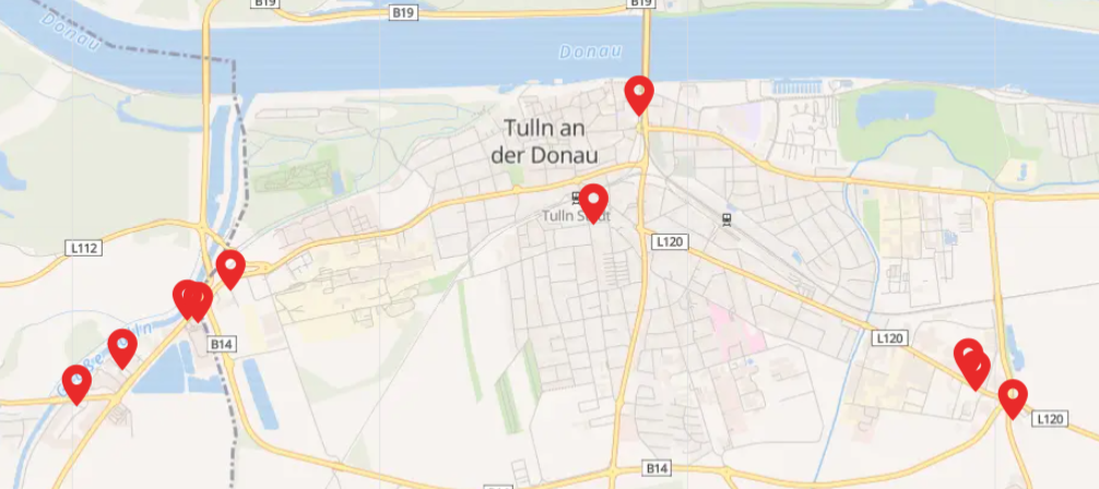 Screenshot vom goingelectric.de Ladestationen Verzeichnis, Filter auf >= 150 kW CCS für Raum Tulln, Niederösterreich (https://www.goingelectric.de/stromtankstellen/)