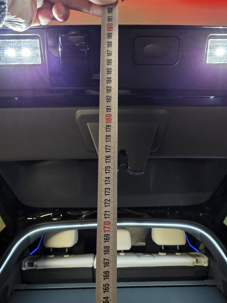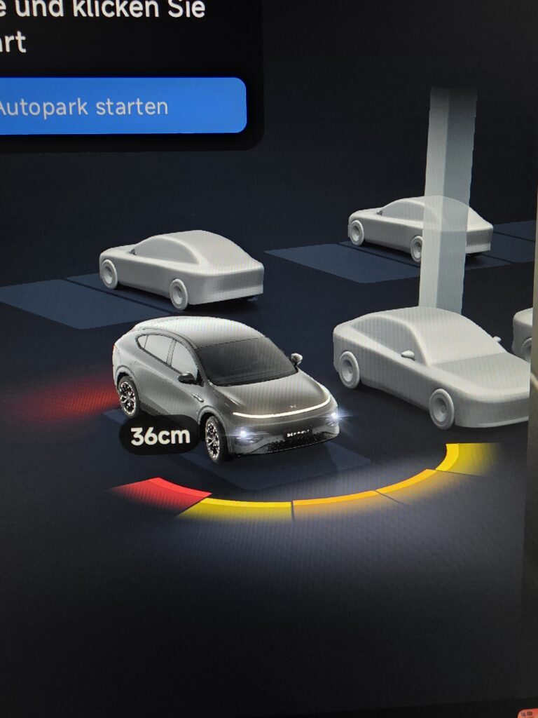 Im Vergleich zum IONIQ 5 zeigt der G6 die Distanz zu Hindernissen in Zentimetern auf dem Display an. Wie exakt dies funktioniert hat mich mal interessiert und es abgemessen, da ich ja in der Garage nicht zu weit nach vor fahren darf, damit der Kofferraum (trotz 90% Öffnung) nicht an der Decke ansteht. Kurz: es ist quasi auf den Zentimeter genau 🙂