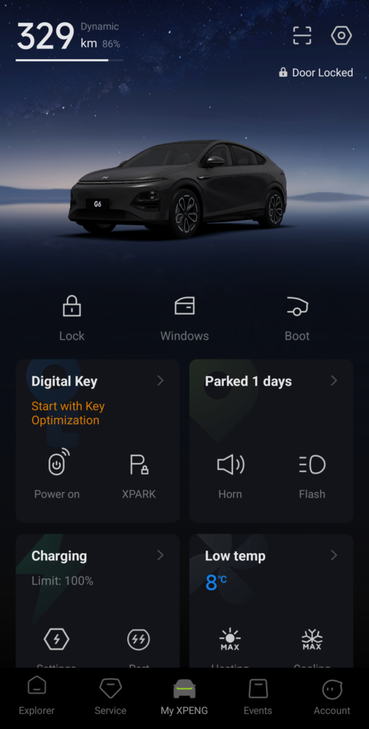Der G6 verfügt in der aktuellsten Software-Version (5.8) über Dashcam bzw. Wächtermodus (XGUARD) -Funktionen. Letzterer überwacht das Fahrzeug (ähnlich zum Sentry-Modus bei Tesla), während dies abgestellt und verschlossen ist. Es wird die Umgebung über die Außenkameras aufgezeichnet, wenn sich Personen annähern oder das Auto berühren. Hierzu gibt es drei unterschiedliche Modi zur Einstellung der Empfindlichkeit. Details dazu habe ich bisher aber noch nicht entdeckt, es gibt auch noch keine offizielle Anleitung zu diesen Features.