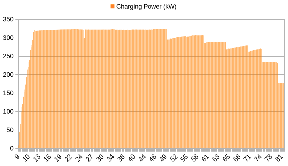Hier noch ein paar Details zum Ladevorgang. Das Fahrzeug hatte über längere Zeit eine Ladeleistung über 300kW und im Peak wurden auch die 325kW (650V*500A) erreicht – dies sogar relativ lange zwischen ca. 12-50%. Wahnsinn, davon können andere Fahrzeuge nur träumen. Eine Ladekurve direkt von dieser Ladesäule gibt es leider nicht, aber ich habe die aufgezeichneten Carscanner Werte als Diagramm dargestellt: