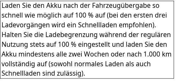 Einzig für mich etwas umständlich ist der Umstand, dass der LFP Akku insbesondere zu Beginn, aber auch generell des Öfteren auf 100% geladen werden soll – dies im Gegensatz zu anderen Akku-Technologien, die man eher nicht auf 100% laden und dann längere Zeit stehen lassen sollte. Nachdem ich zu Hause über keine Lademöglichkeit verfüge, muss ich somit unterwegs öfter mit DC/HPC Chargern auf 100% nachladen, da ich nicht umständlich extra eine AC-Ladestation anfahren will. Hier ein Auszug aus der Bedienungsanleitung: