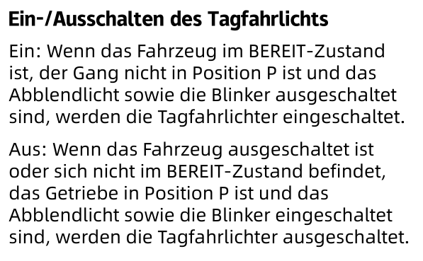 Das Tagfahrlicht ist somit also nur aktiv, wenn man fährt (also nicht parkt). Gleichzeitig ist hier aber hinten nichts beleuchtet. (Screenshot aus der Bedienungsanleitung)