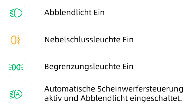 Licht entweder ganz aus (off), Begrenzungslicht an, Abblendlicht an, oder “AUTO”. Zusätzlich gibt es noch Nebelschlussleuchten (Screenshots aus der Bedienungsanleitung)