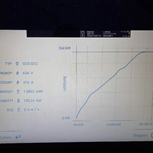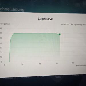 Sollte ich mal in der Gegend eine Ladesäule entdecken, die 600A schafft, müssten theoretisch auch 395kW Ladeleistung im Peak möglich sein.