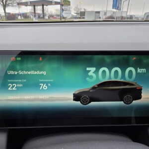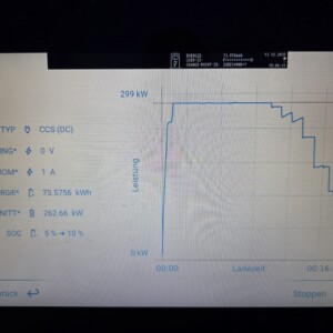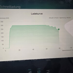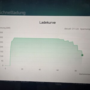 Eine weitere DC-Ladung konnte ich noch an einer 300kW Ladestation mit 500A dokumentieren. Hier merkt man, dass das Auto viel mehr Leistung unterstützen würde, da es relativ lange bei 300 kW Peak quasi oben ansteht. Wird aber wohl auch den Akku etwas mehr schonen, nicht mit voller möglicher Leistung zu laden 😉