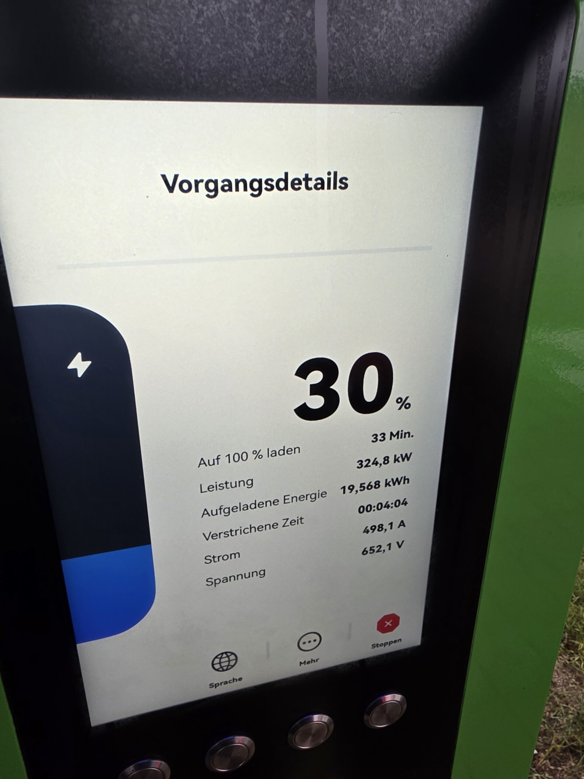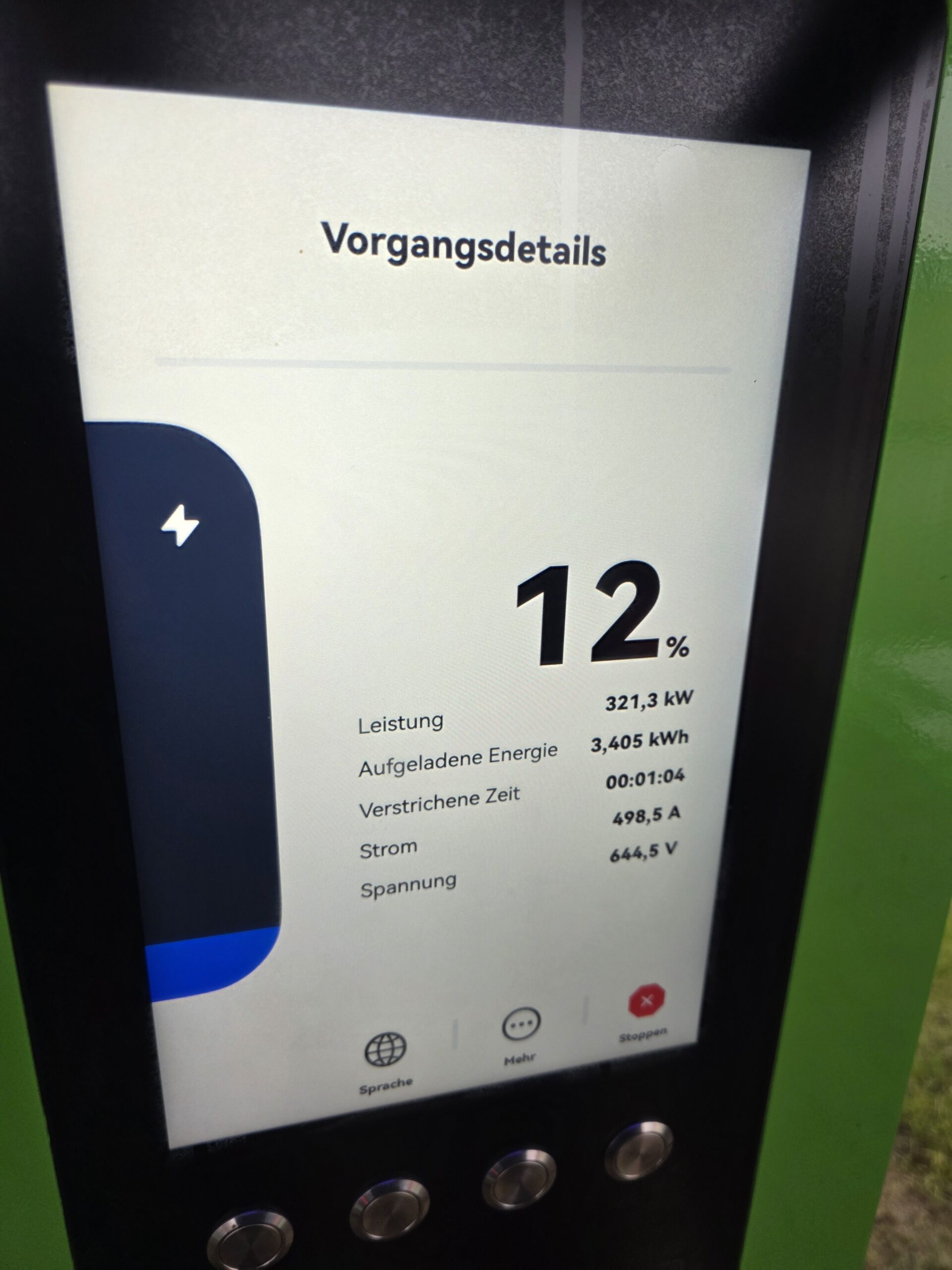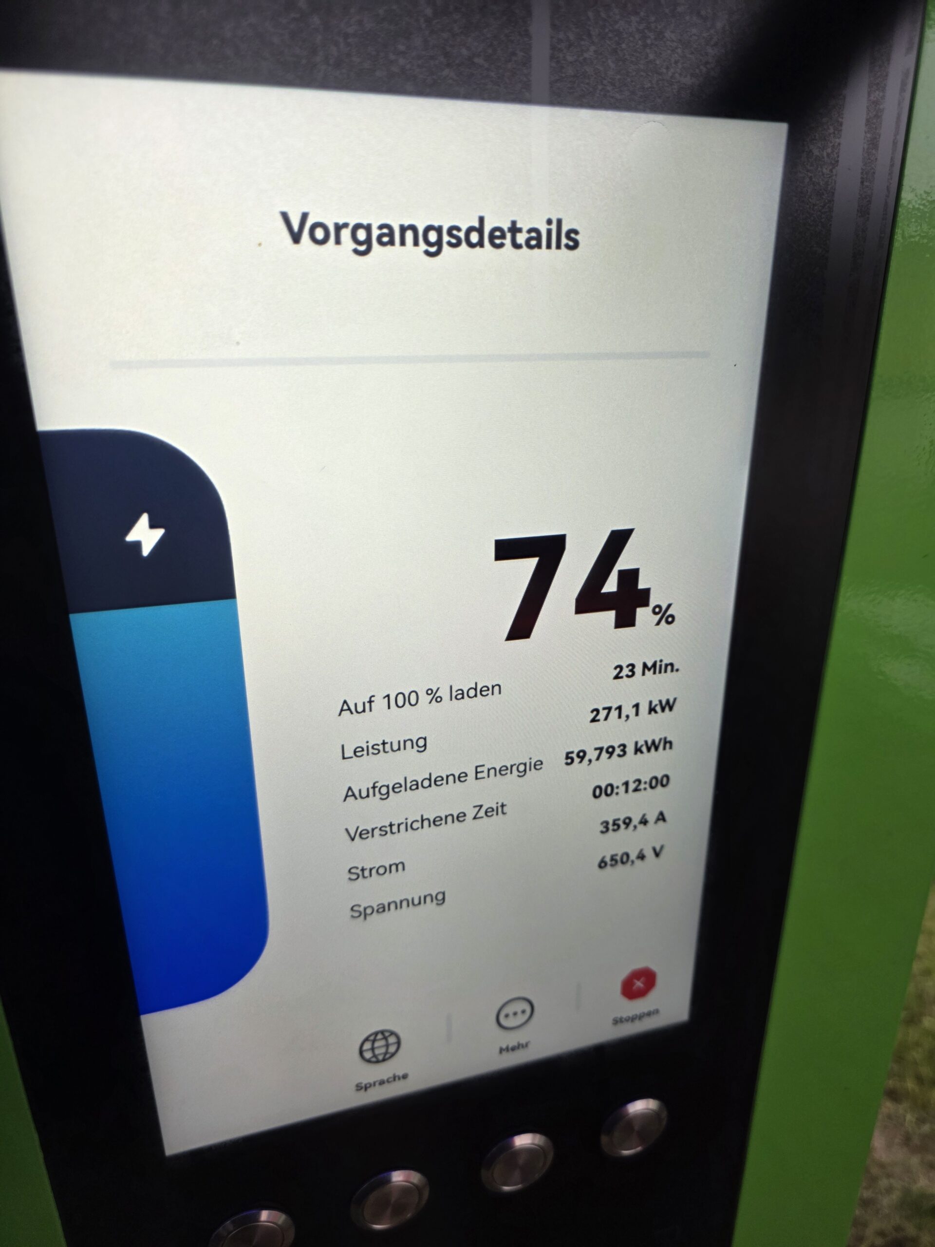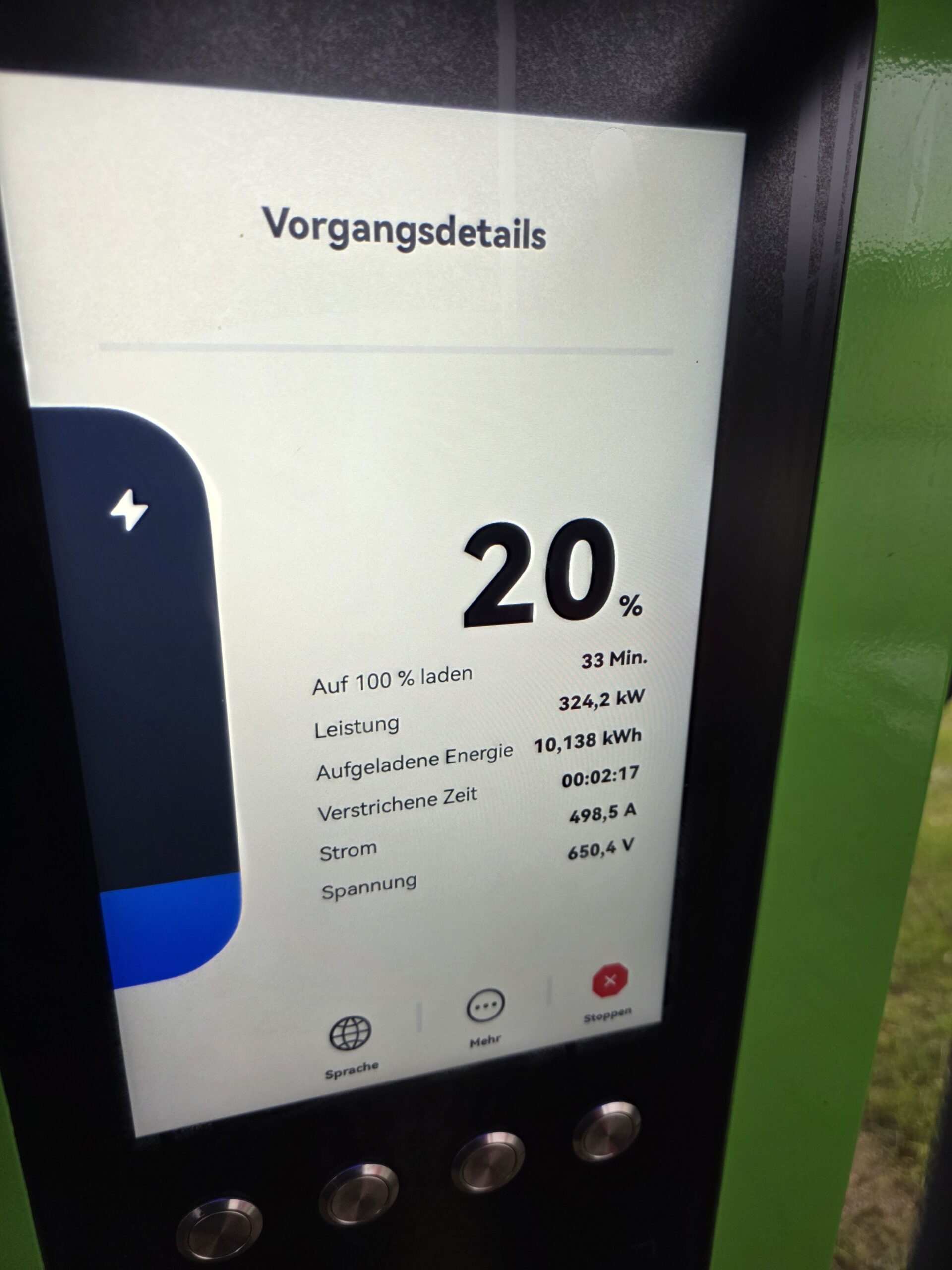 Sollte ich mal in der Gegend eine Ladesäule entdecken, die 600A schafft, müssten theoretisch auch 395kW Ladeleistung im Peak möglich sein.