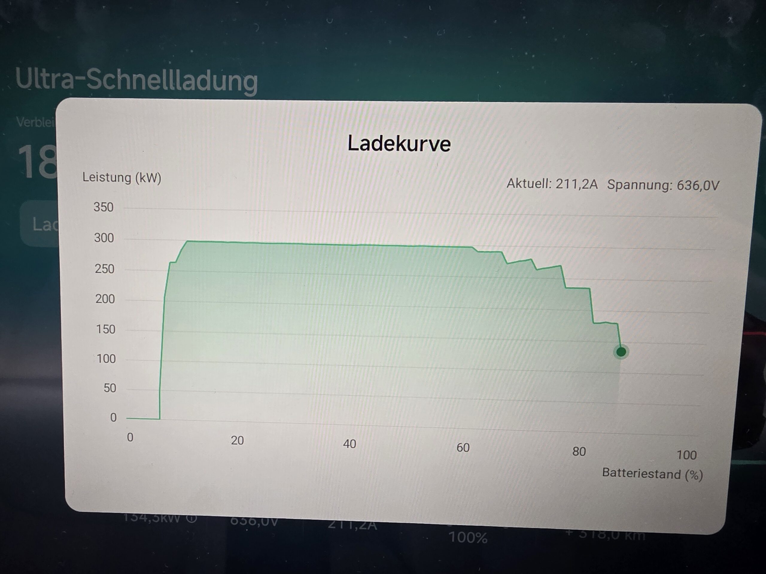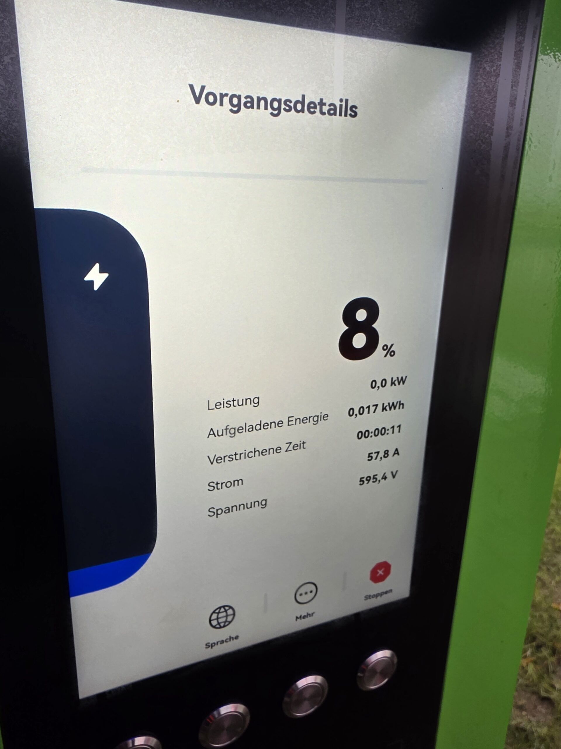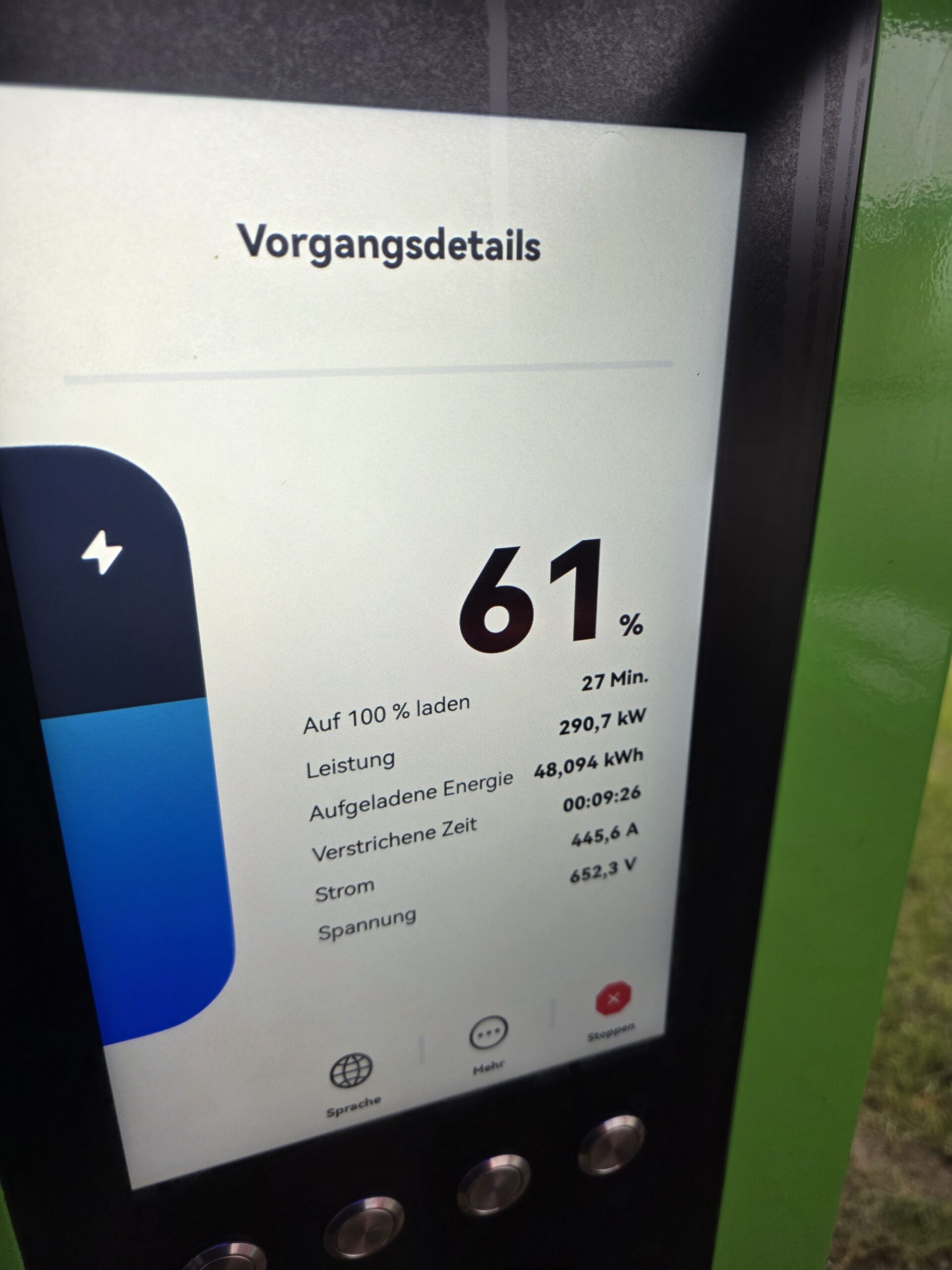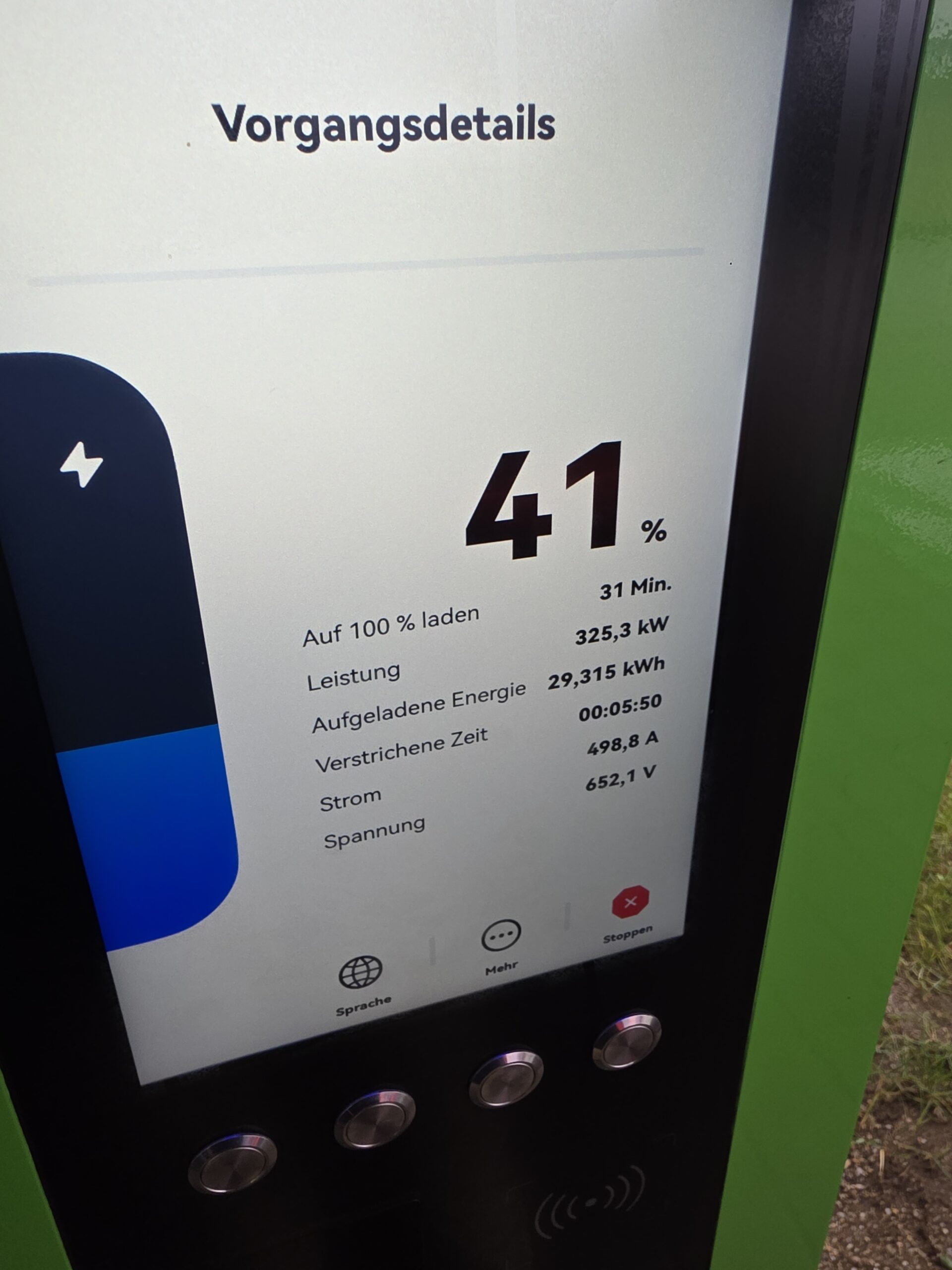 Sollte ich mal in der Gegend eine Ladesäule entdecken, die 600A schafft, müssten theoretisch auch 395kW Ladeleistung im Peak möglich sein.
