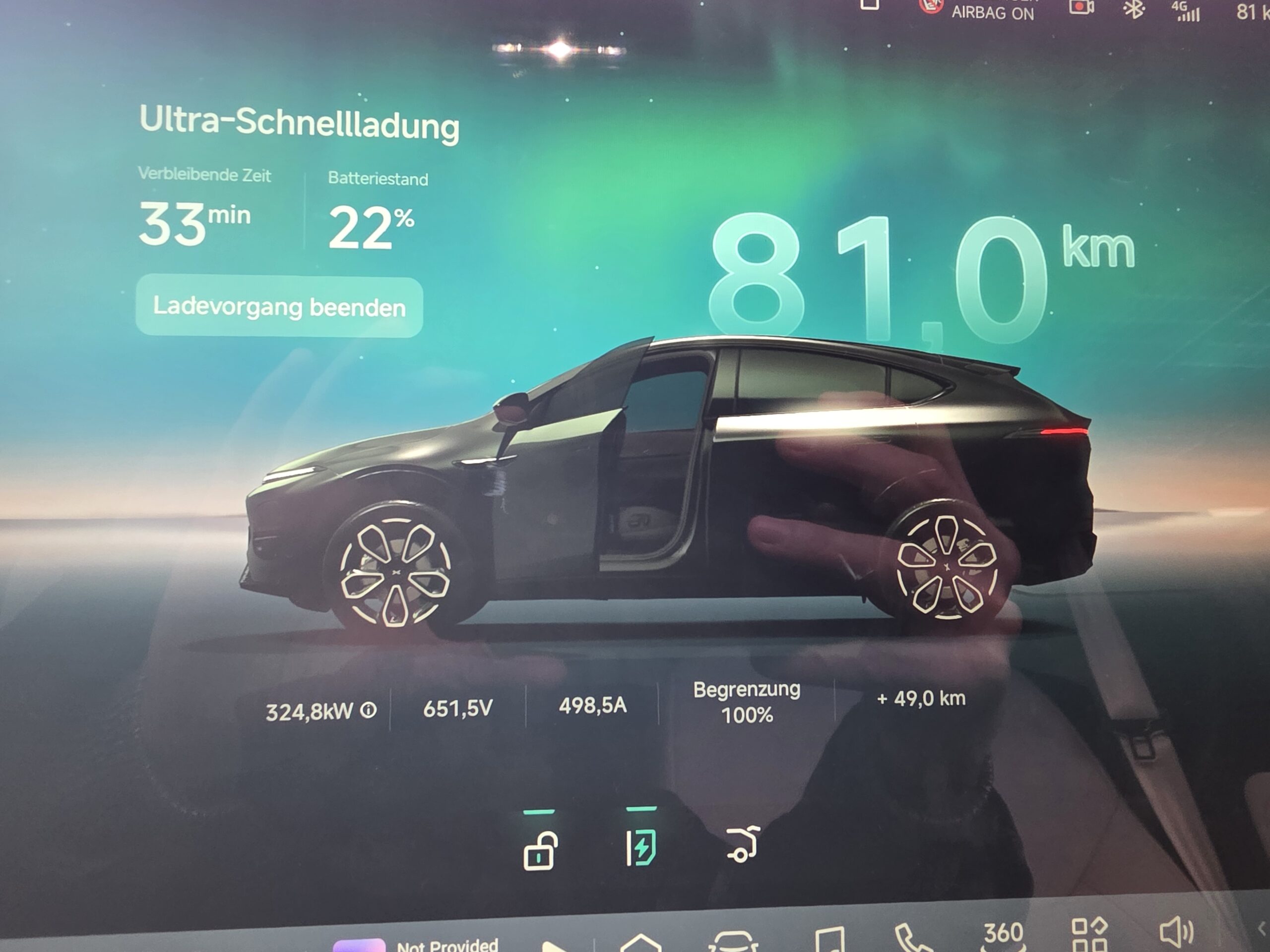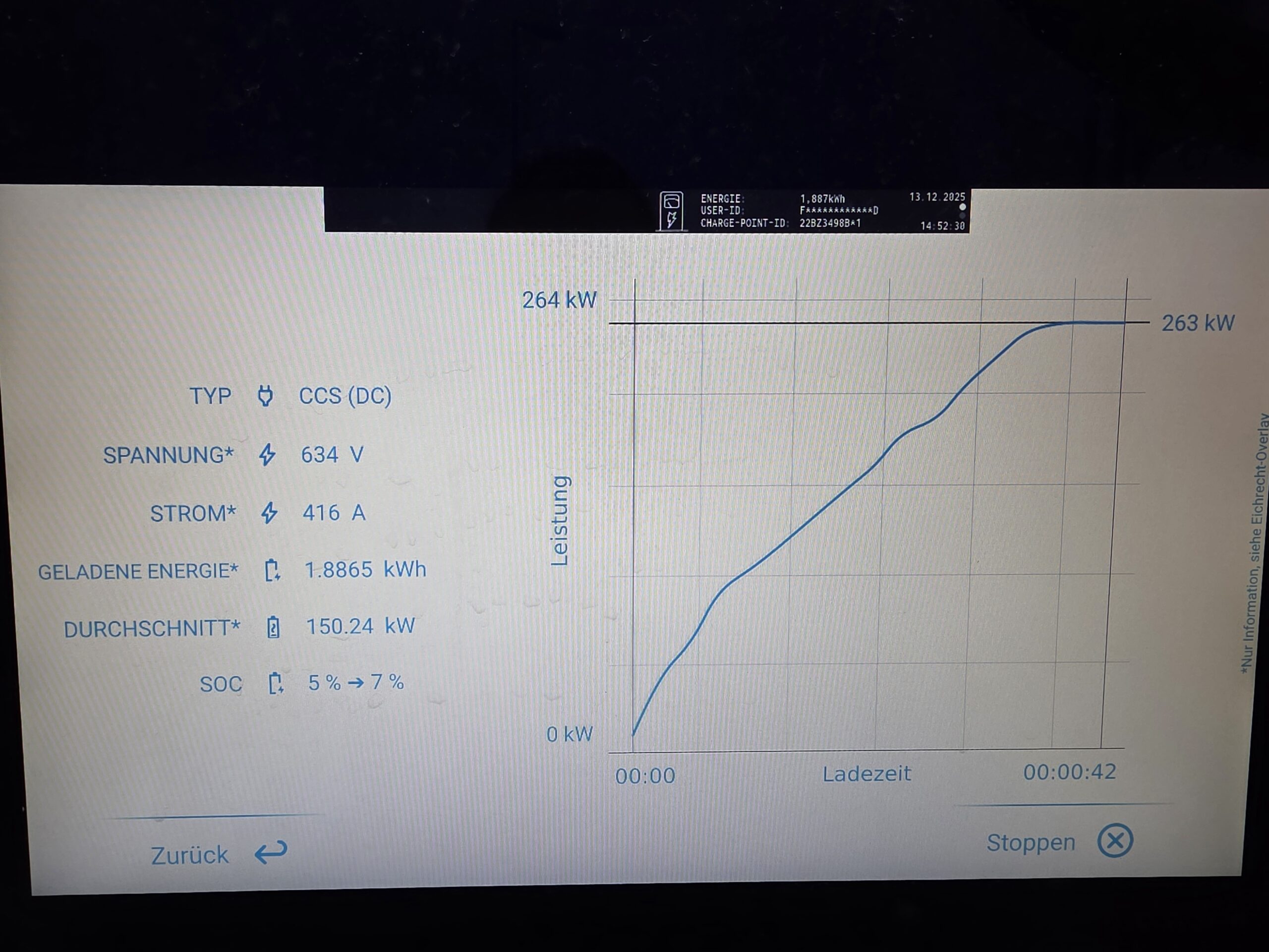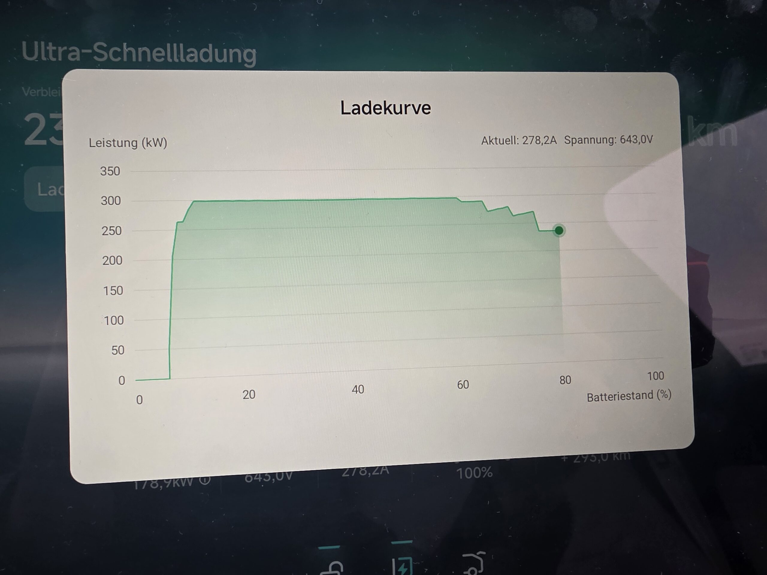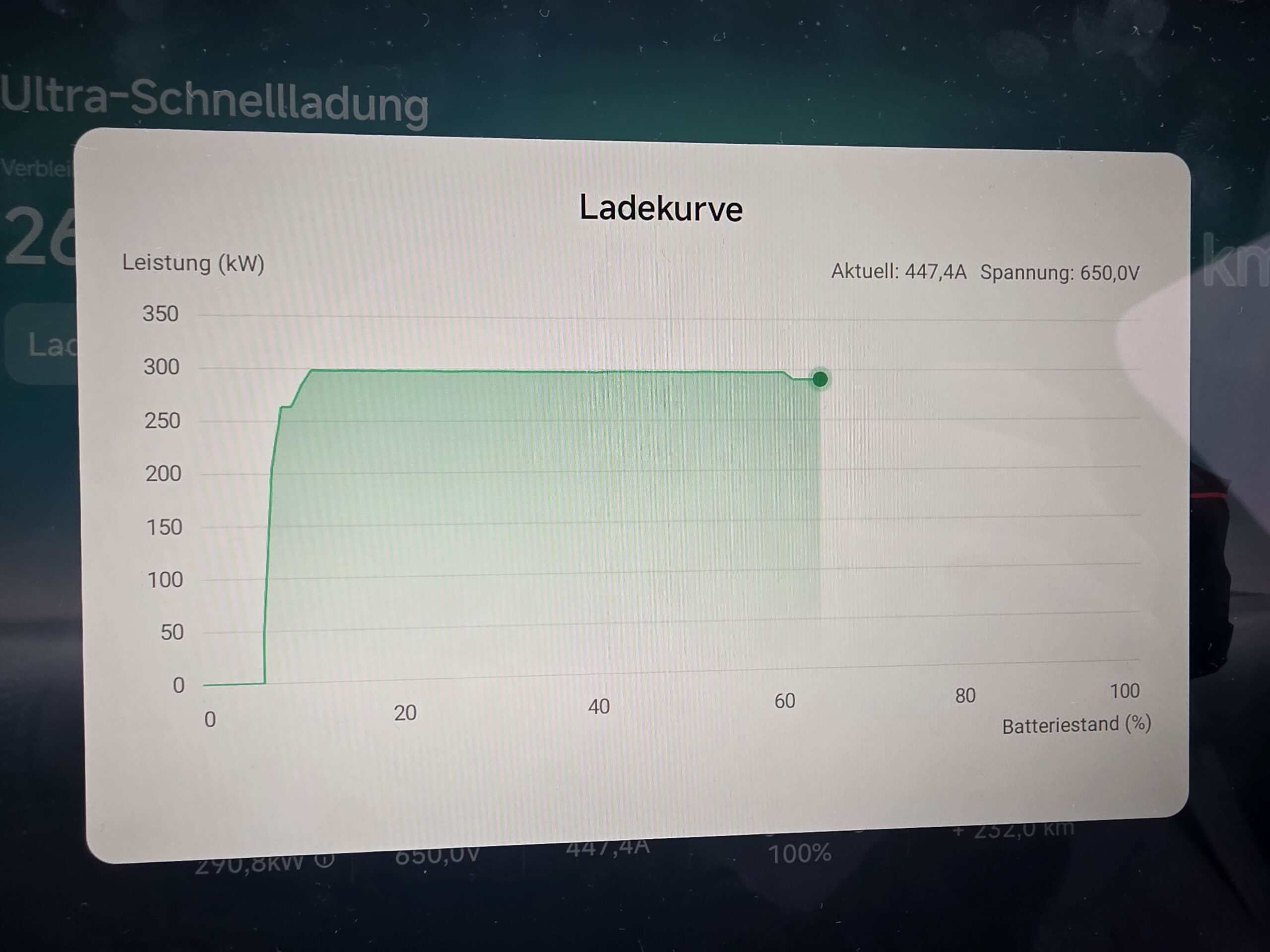 Sollte ich mal in der Gegend eine Ladesäule entdecken, die 600A schafft, müssten theoretisch auch 395kW Ladeleistung im Peak möglich sein.