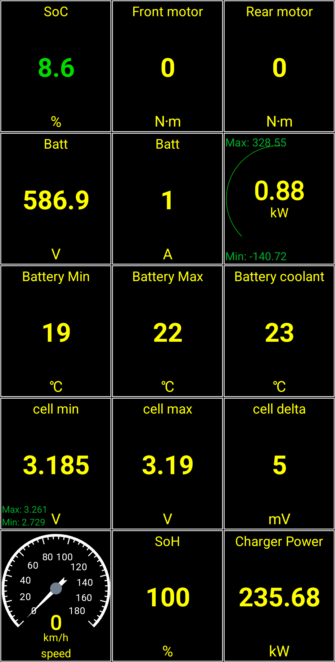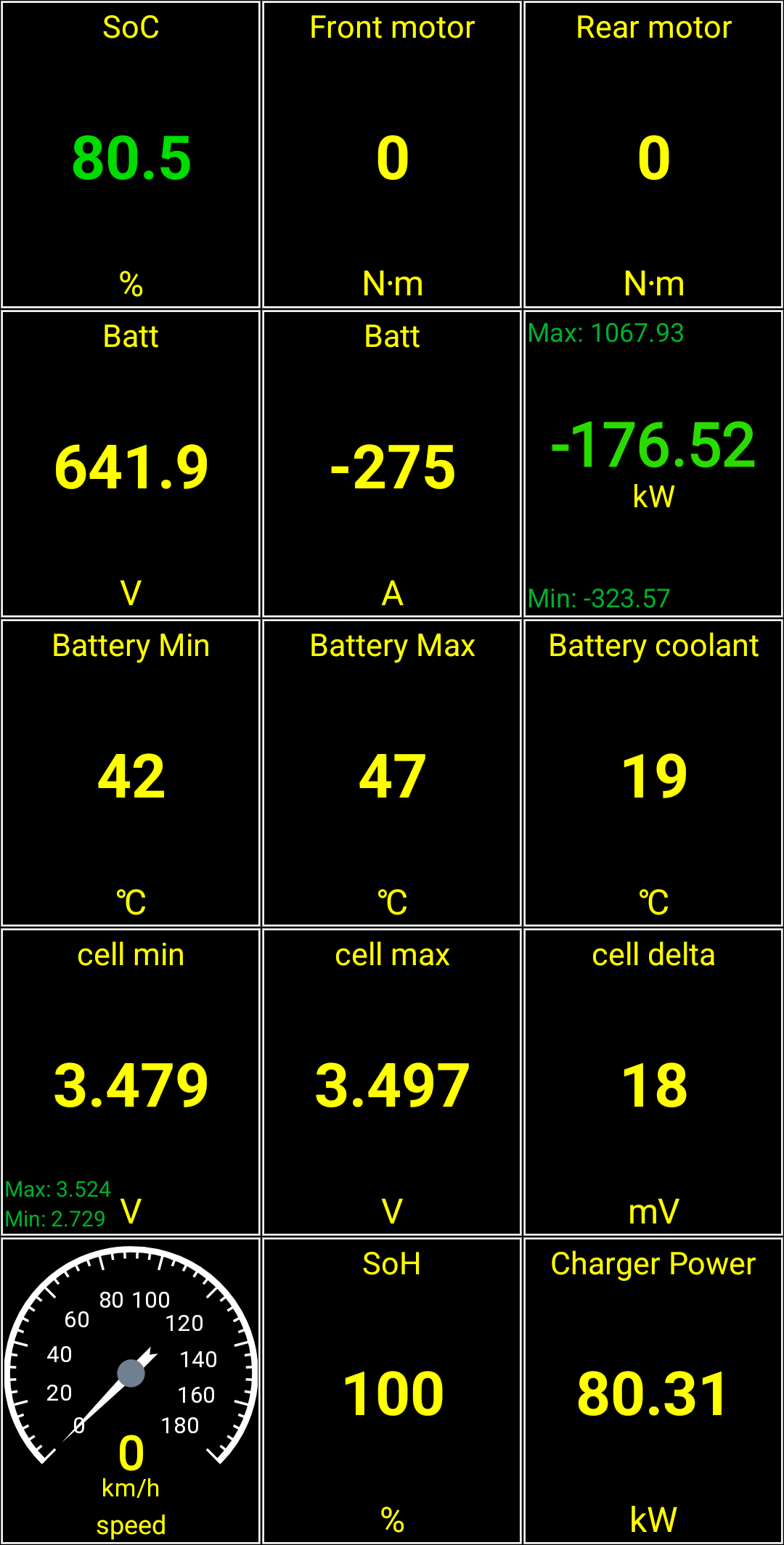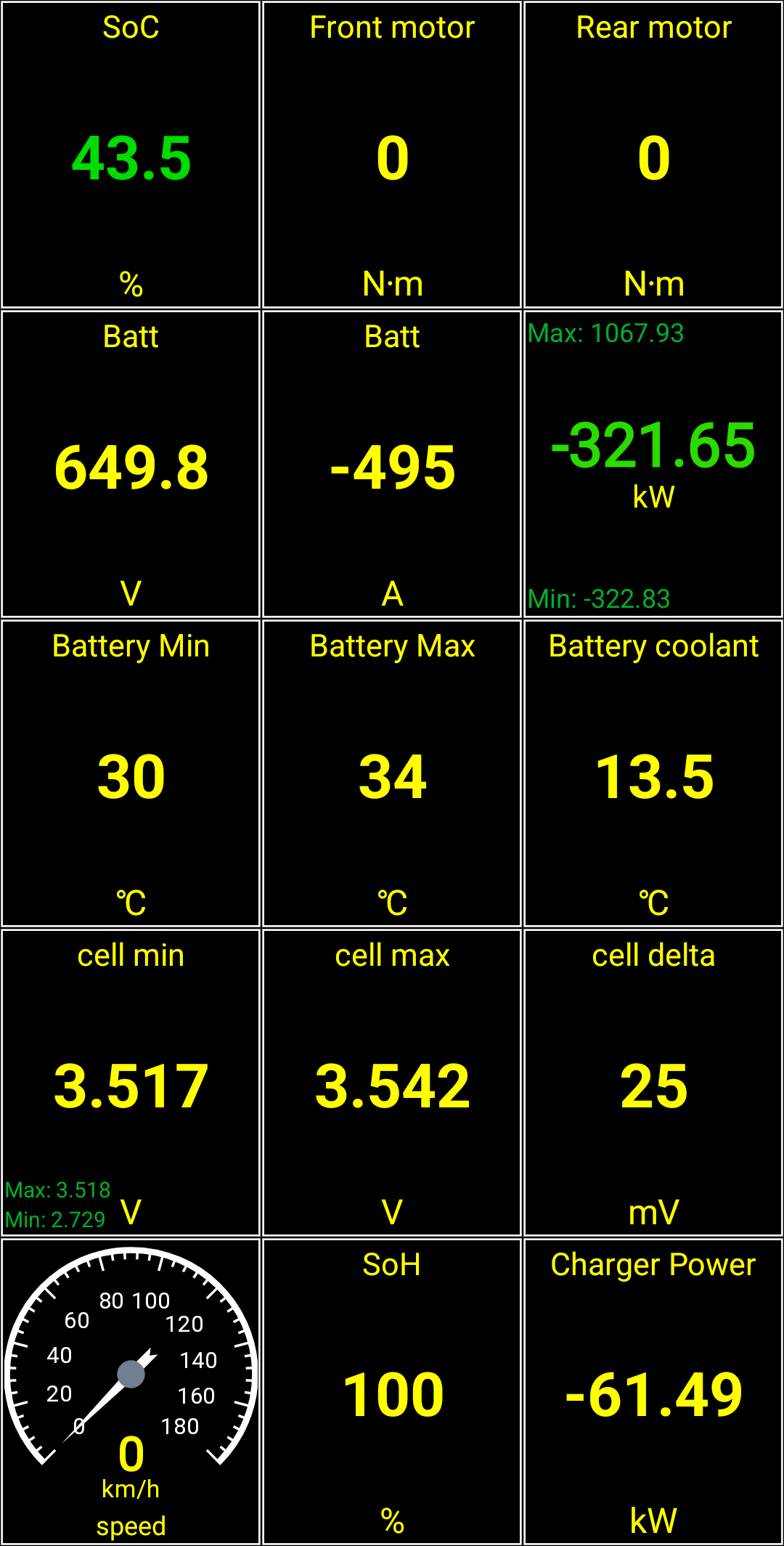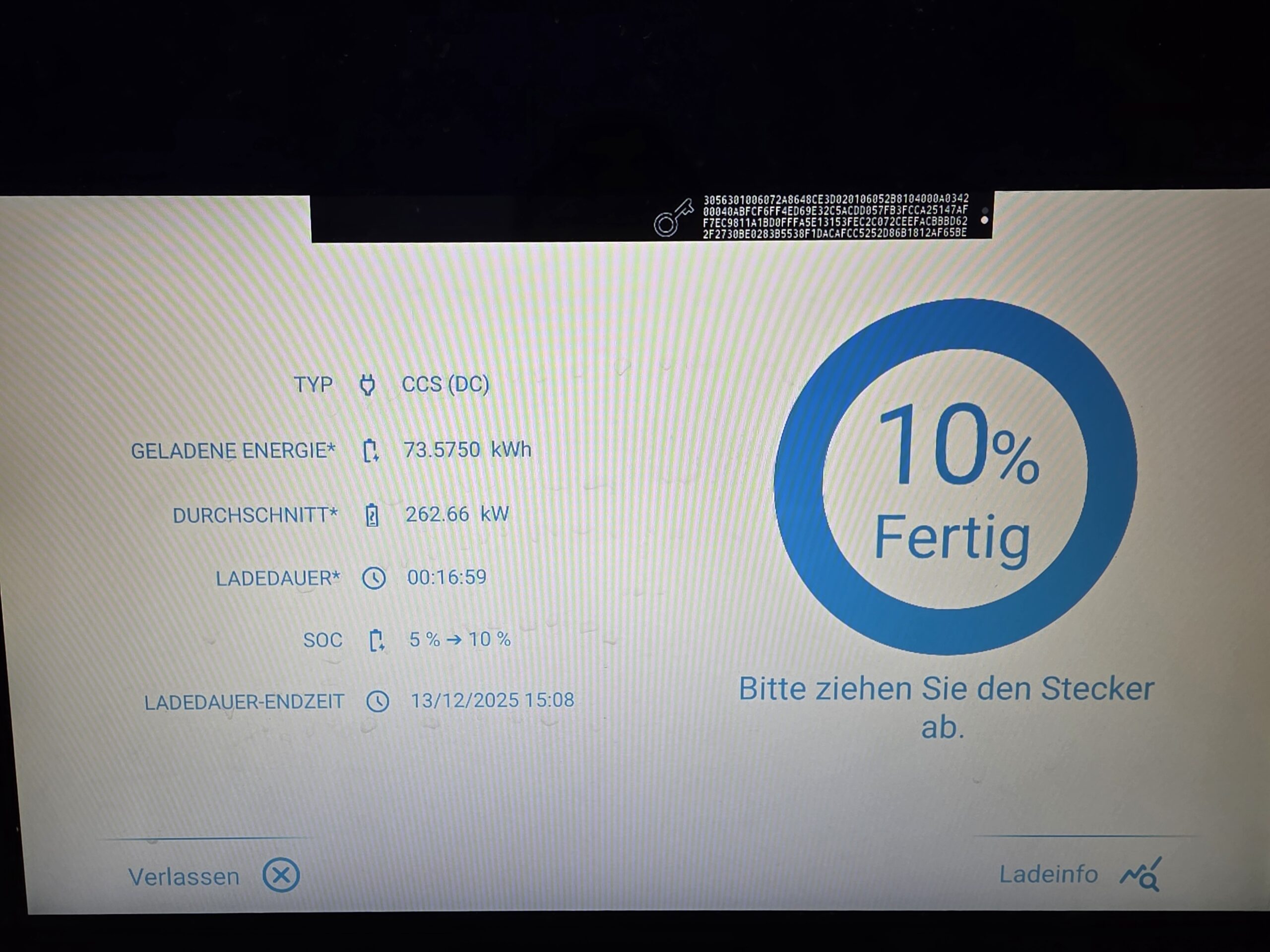 Sollte ich mal in der Gegend eine Ladesäule entdecken, die 600A schafft, müssten theoretisch auch 395kW Ladeleistung im Peak möglich sein.