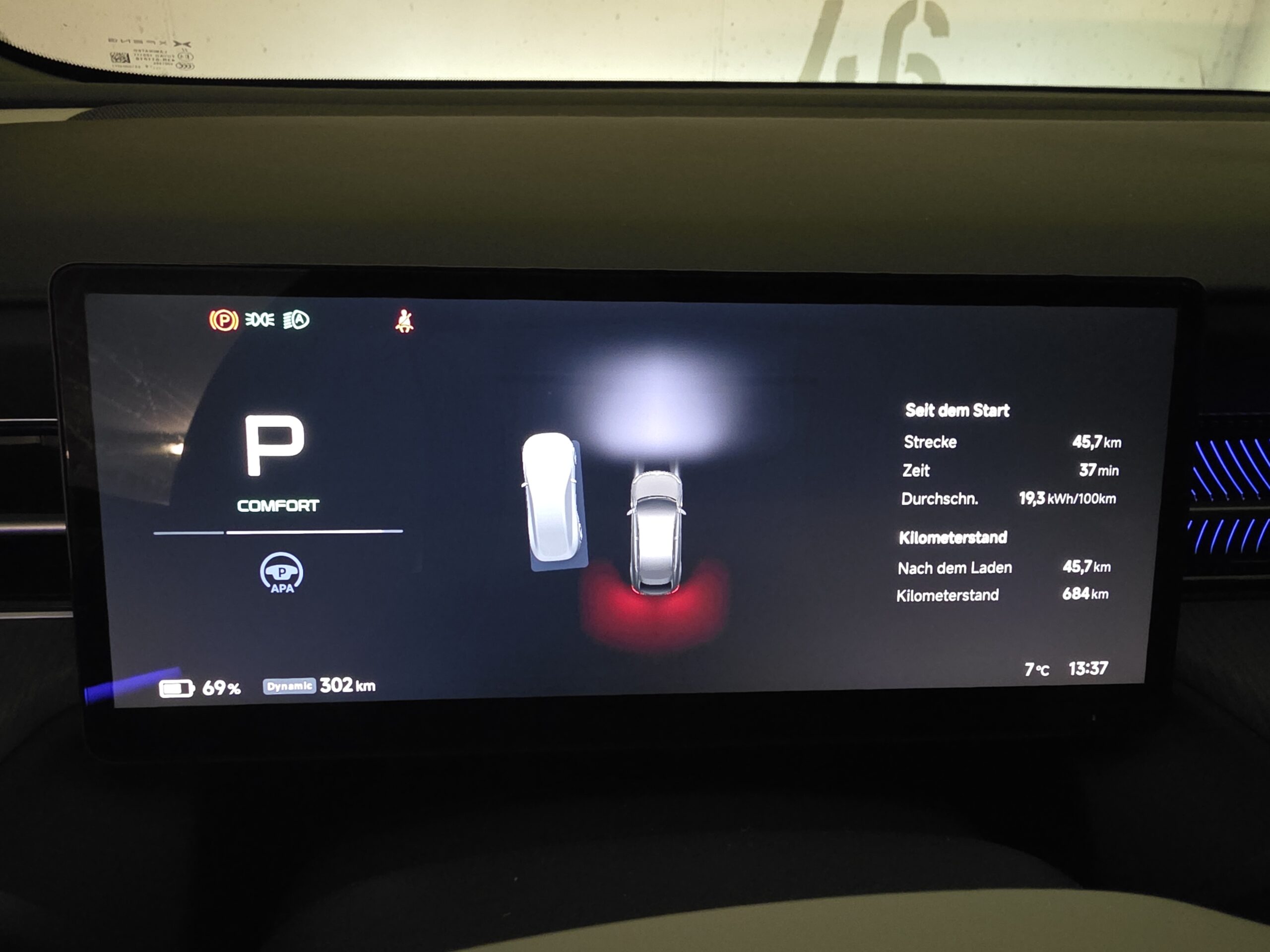 Im Vergleich zum IONIQ 5 zeigt der G6 die Distanz zu Hindernissen in Zentimetern auf dem Display an. Wie exakt dies funktioniert hat mich mal interessiert und es abgemessen, da ich ja in der Garage nicht zu weit nach vor fahren darf, damit der Kofferraum (trotz 90% Öffnung) nicht an der Decke ansteht. Kurz: es ist quasi auf den Zentimeter genau 🙂