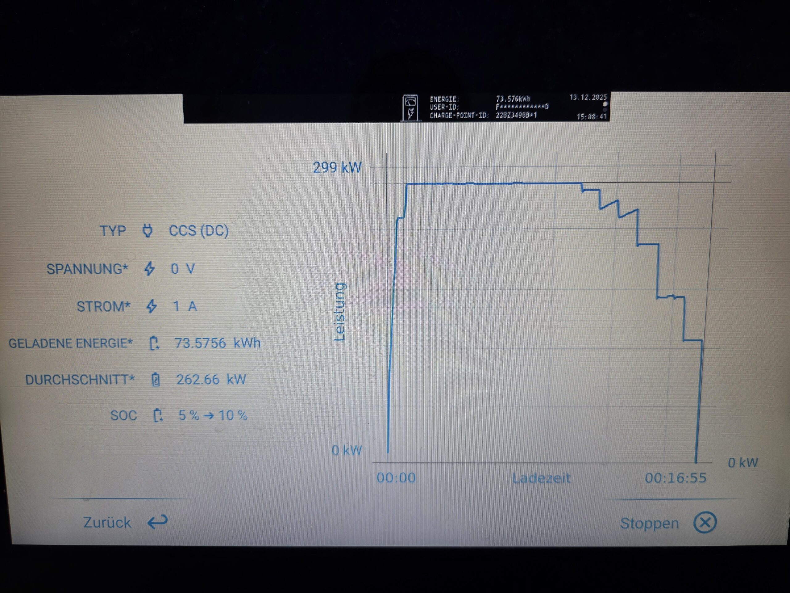 Eine weitere DC-Ladung konnte ich noch an einer 300kW Ladestation mit 500A dokumentieren. Hier merkt man, dass das Auto viel mehr Leistung unterstützen würde, da es relativ lange bei 300 kW Peak quasi oben ansteht. Wird aber wohl auch den Akku etwas mehr schonen, nicht mit voller möglicher Leistung zu laden 😉