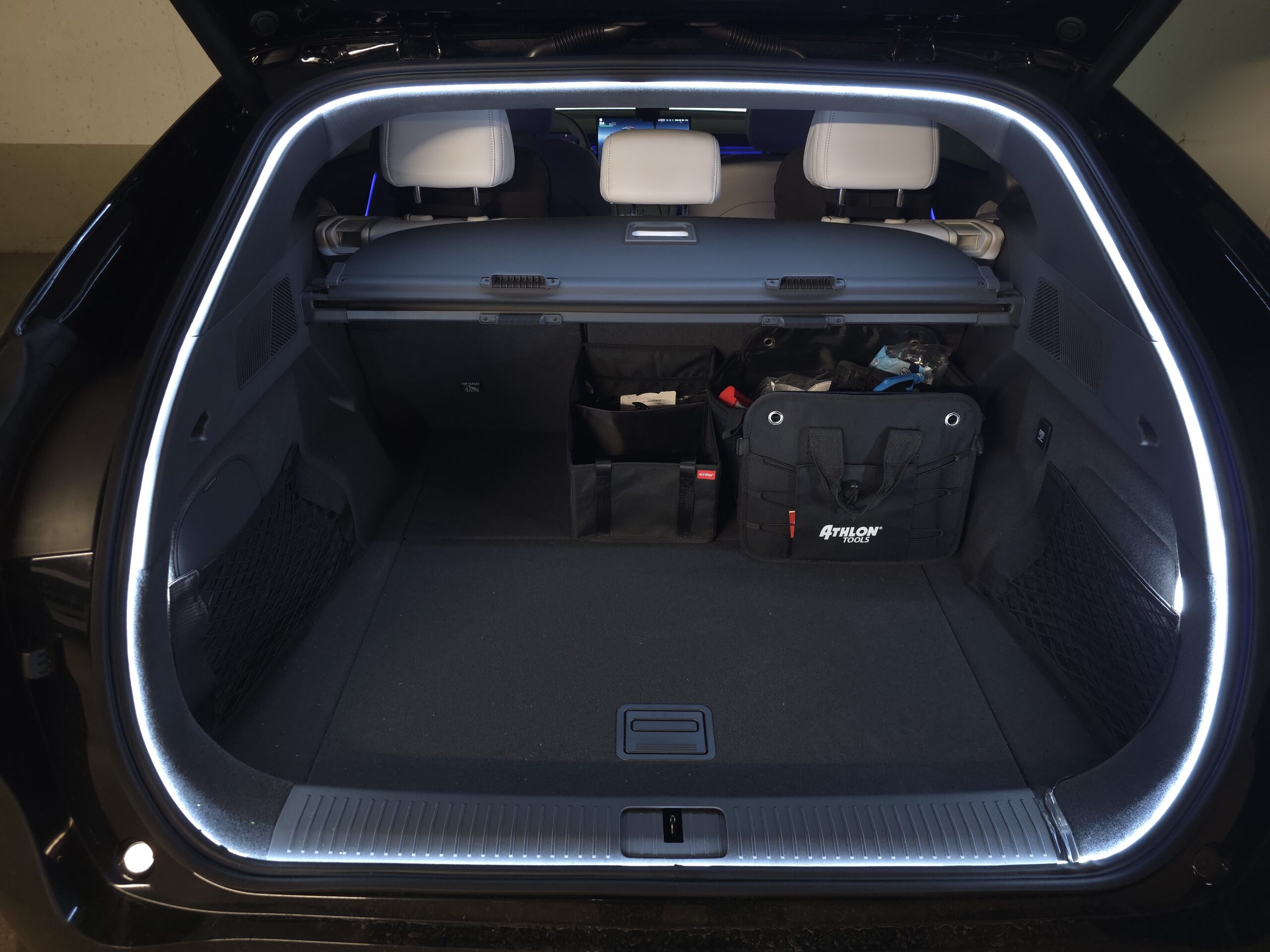 Daher habe ich auf Amazon noch zusätzliches Zubehör – eine 4m LED-Lichtleiste für den Kofferraum bestellt – und die passt auch perfekt. Angeschlossen wird das einfach an die vorhandenen Leuchten und unter dem Dichtgummi verlegt, weshalb diese auch nur aktiv sind, wenn der Kofferraum geöffnet ist.