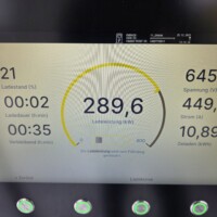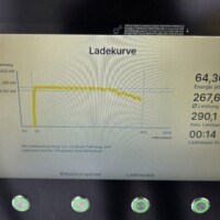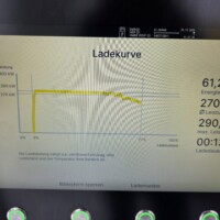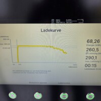 Der Akku war nicht optimal temperiert – Min 16°C, Max 21°C, somit ist wohl nicht mit der vollen Ladeleistung zu rechnen. Der Ladepark war außerdem auch halbwegs gut besucht und von den sechs Ladesäulen, waren fünf belegt, also jeweils mit einem Auto. Somit war eventuell auch die Leistung des Netzanschlusses begrenzt. Jedenfalls lud der XPENG G6 immerhin mit 290kW im Peak und das dafür sogar nahezu durchgehend bis zum Schluss. Im Schnitt lag die Ladeleistung von 9% bis 85% bei 260kW. Die folgenden Fotos sind von der Ladekurve – bzw. wohl eher “Ladelinie” – an der HYC400 Station: