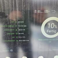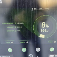 Es war geplant eine 400 kW Ladestation in Spielberg anzufahren, wir mussten aber dazwischen nochmal eine kurze WC-Pause an einer Raststation am Weg (bei 22% SOC, Kilometerstand 1493) einlegen – daher lief wohl auch die Akku-Vortemperierung nicht wie geplant durch. Bei der Smatrics/EnBW-Ladestation sind wir mit 9% Ladestand angekommen (Kilometerstand 1529).